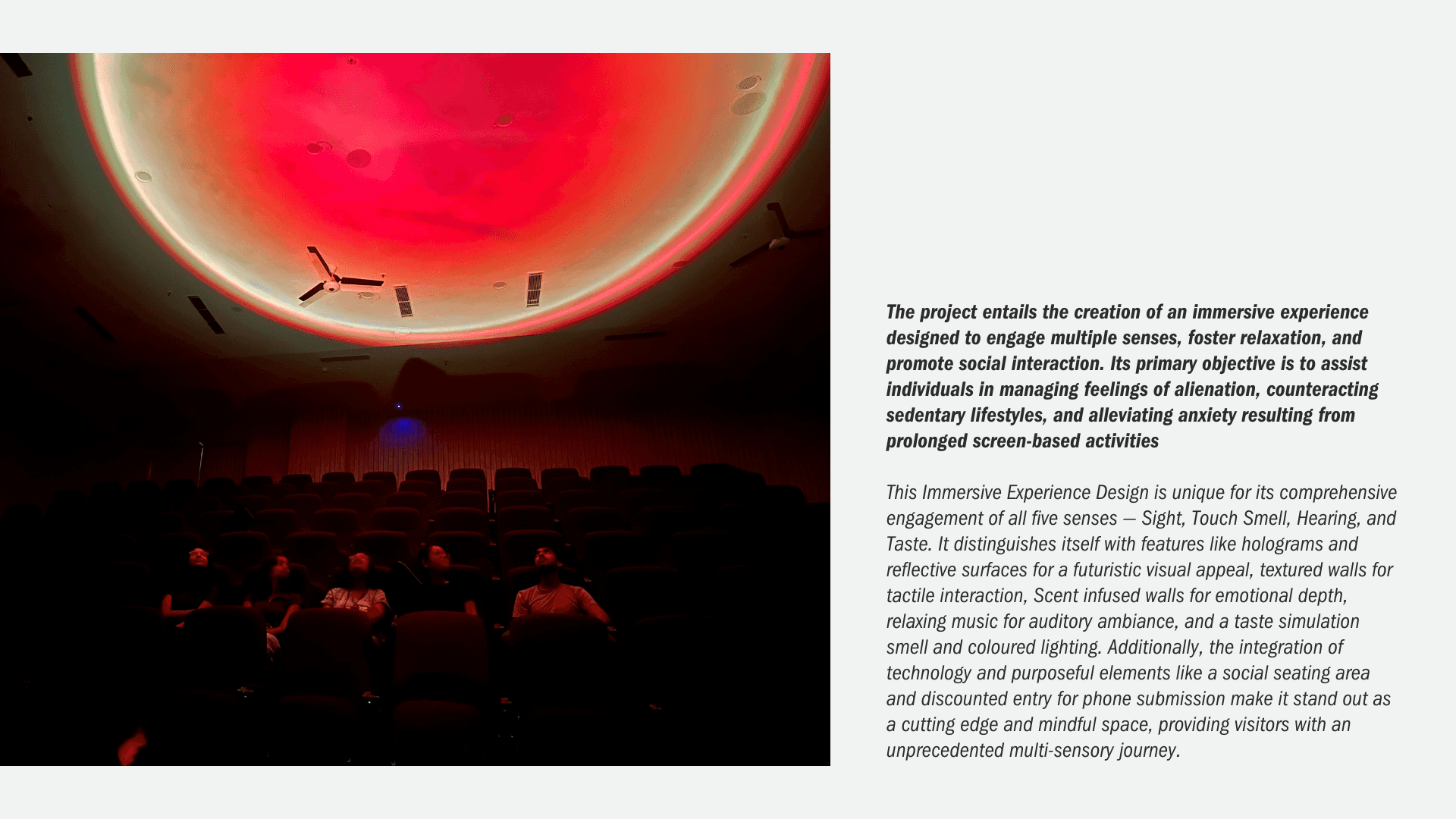 The project entails the creation of an immersive experience designed to engage multiple senses, foster relaxation, and promote social interaction.