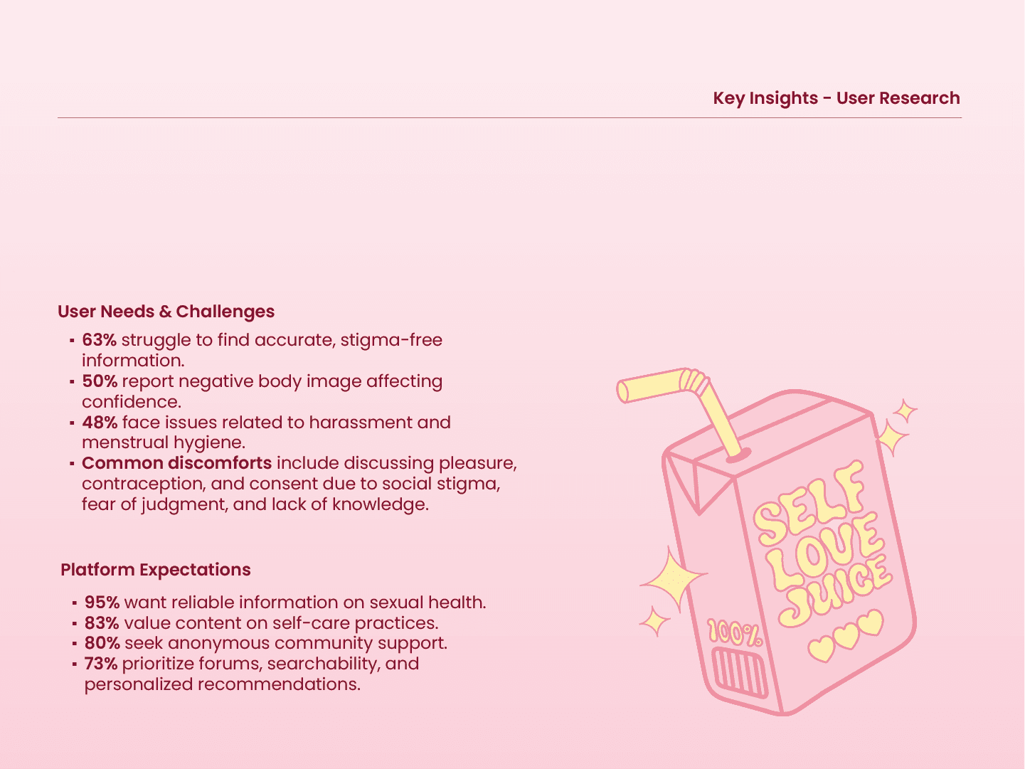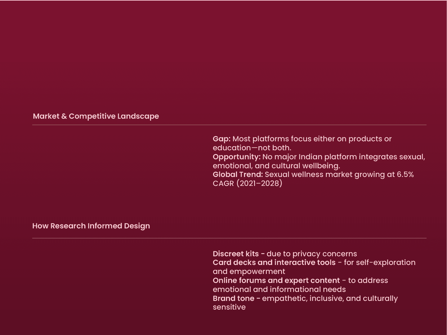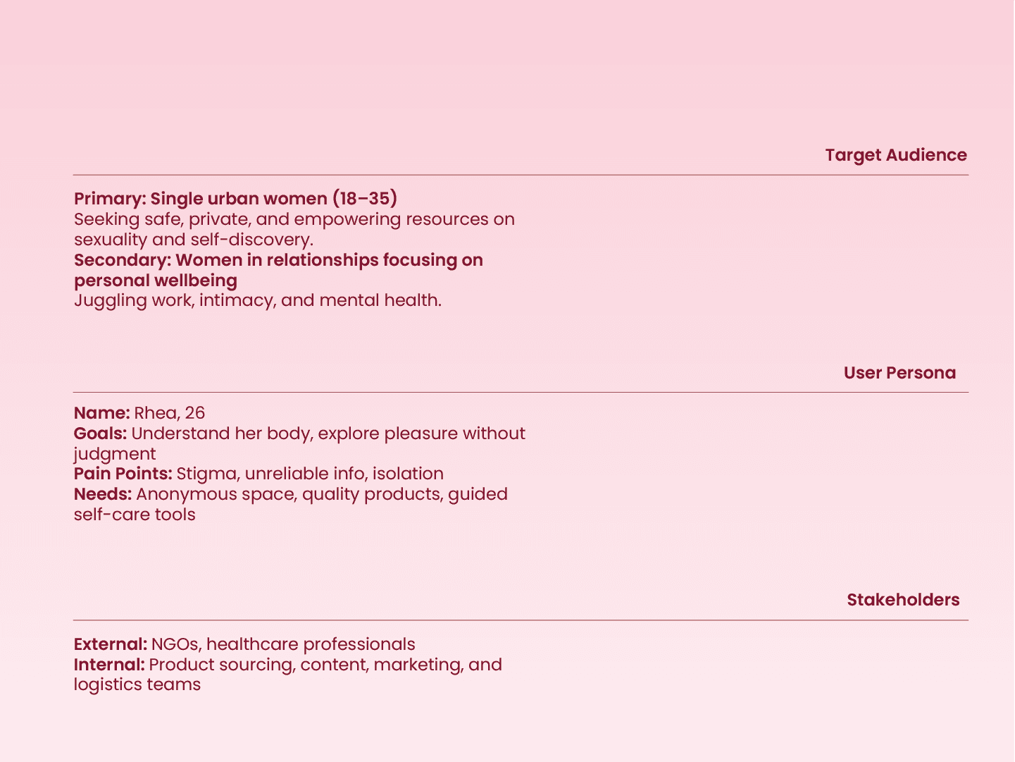 This project aims to create a culturally sensitive sexual wellness platform and discreet self-care kit for single urban women in India, offering reliable education, expert support, and a judgment-free community. It bridges traditional norms with modern needs to promote self-love, sexual well-being, and empowerment.